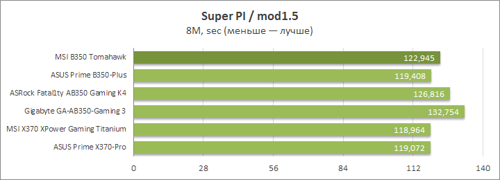 Во многопоточном wPrime у испытуемой хорошие результаты, а вот однопоточный Super PI оголяет не слишком агрессивную работу автоматического повышения частоты, вероятно, эта роль, как и было задумано в AMD, разработчиками переложена на плечи изделий с применением хаба X370.