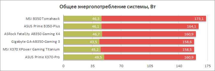 Замеры выполнялись после прохождения всех прочих тестов в «устоявшемся» режиме компьютера при помощи прибора собственной разработки. Для создания нагрузки использовался профиль In-place large FFTs в составе утилиты Prime95 (28.10). Производился расчёт среднего значения потребления тестового стенда «от розетки» на протяжении восьми минут работы программы, а затем, после завершения теста, ещё минуту замерялся уровень, соответствующий состоянию простоя системы.