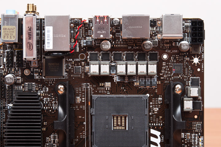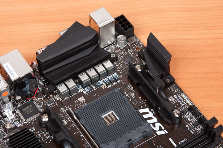 Радиаторы для силовых элементов небольшие, максимально отдалённые от сокета с целью улучшения совместимости с охладителями ЦП.