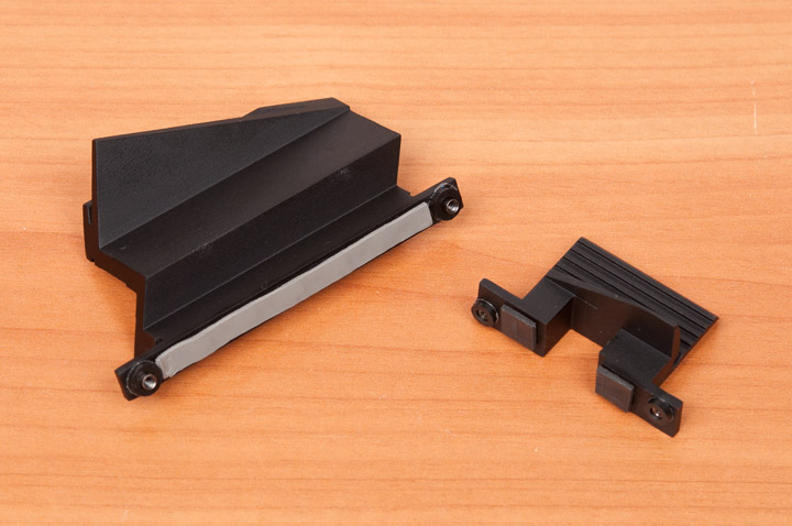 Оба радиатора весьма необычны. Ответственный за отвод тепла со стабилизатора SOC Voltage изготовили, очевидно, по остаточному принципу, настолько вычурно он выглядит. Неполный контакт со сборками не стал удивительным. Другое дело — основной, для CPU Voltage. Площадь основания целиком достаточна для полного соприкосновения с нуждающимися в отводе тепла компонентами. И всё же чуть большей могла бы стать площадь у промежуточного теплопроводника.