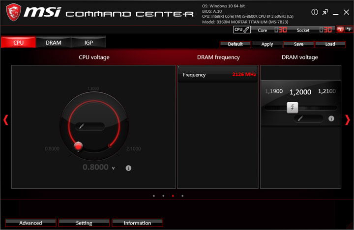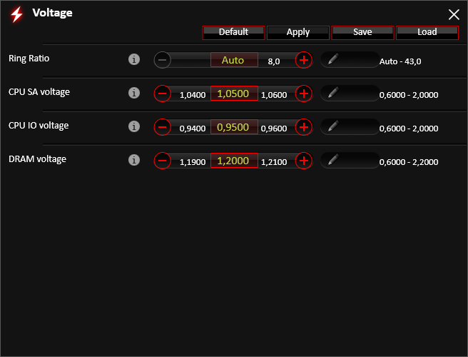 | DRAM Voltage (B) | 0,6–2,2 | 0,01 |