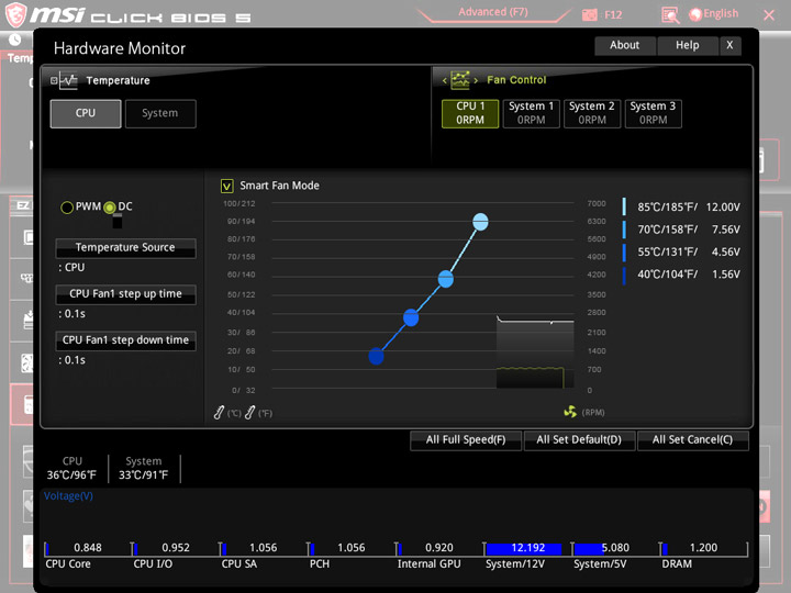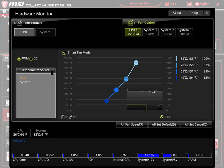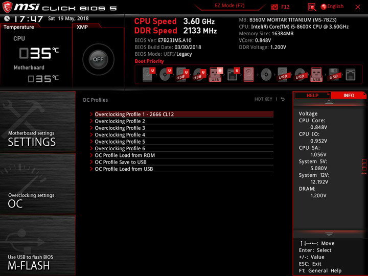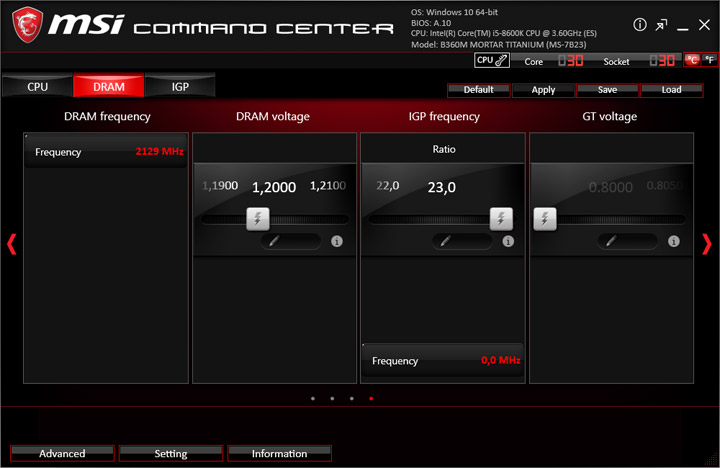 Хранить настройки можно в одном из шести профилей, либо на внешнем носителе. Реализован мониторинг немалого числа действующих в системе напряжений.