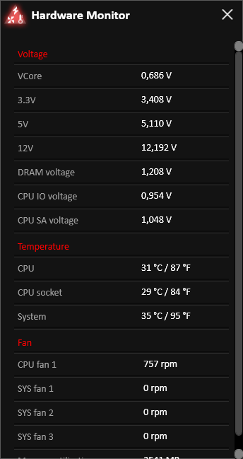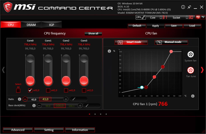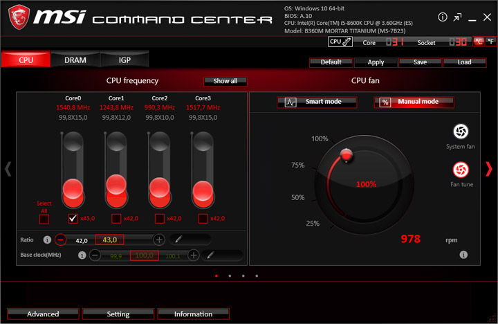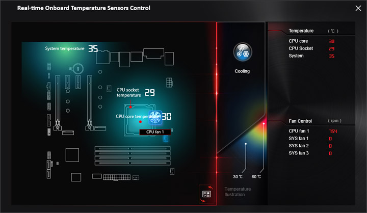 Ввиду фактического отсутствия разгона, впечатляющего поведения от Command Center ждать не стоит. Тут программа может взять на себя роль наблюдателя за системными параметрами. Функциональности новой нет. Как и прежде, наладка охладителей отсюда менее удобна, чем из UEFI.