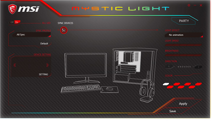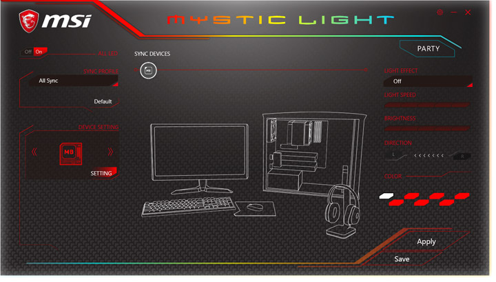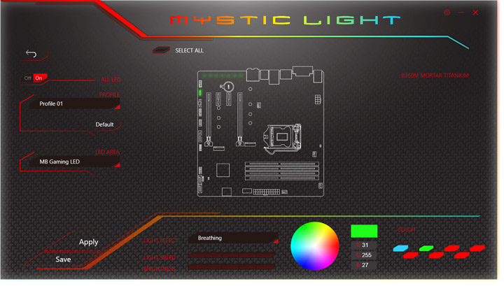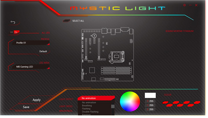 Наличие в составе ПО Mystic Light говорит про поддержку установки любого цвета иллюминации. Кроме того, есть набор разных типов сценария работы подсветки. Можно сформировать несколько профилей и активировать их буквально в несколько кликов.