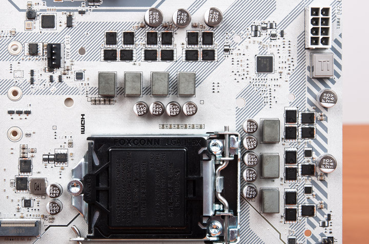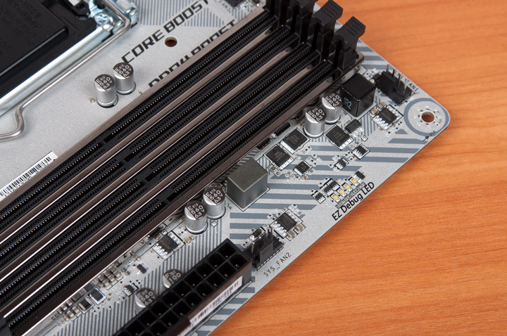 Диагностический уголок расположился в правом верхнем углу. Четыре светодиода белого цвета помогут в базовой диагностике, в случае каких-либо проблем с запуском системы. Подсветки для модулей DRAM или PCI-E, как это происходит в более старших моделях, тут нет.
