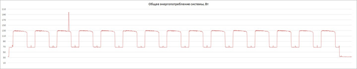 Замеры выполнялись после прохождения всех прочих тестов в «устоявшемся» режиме компьютера при помощи прибора собственной разработки. Для создания нагрузки использовался профиль In-place large FFTs в составе утилиты Prime95 (29.3). Производился расчёт среднего значения потребления тестового стенда «от розетки» на протяжении восьми минут работы программы, а затем, после завершения теста, ещё минуту замерялся уровень, соответствующий состоянию простоя системы.