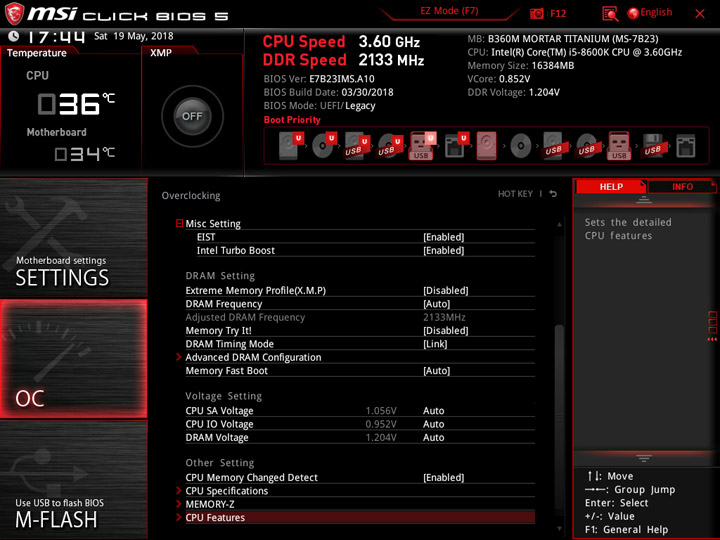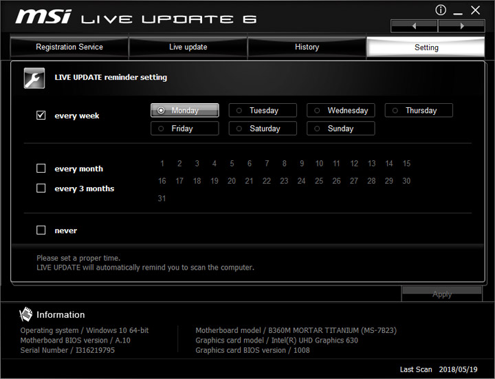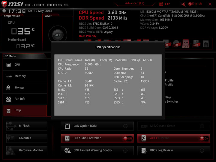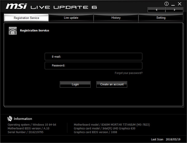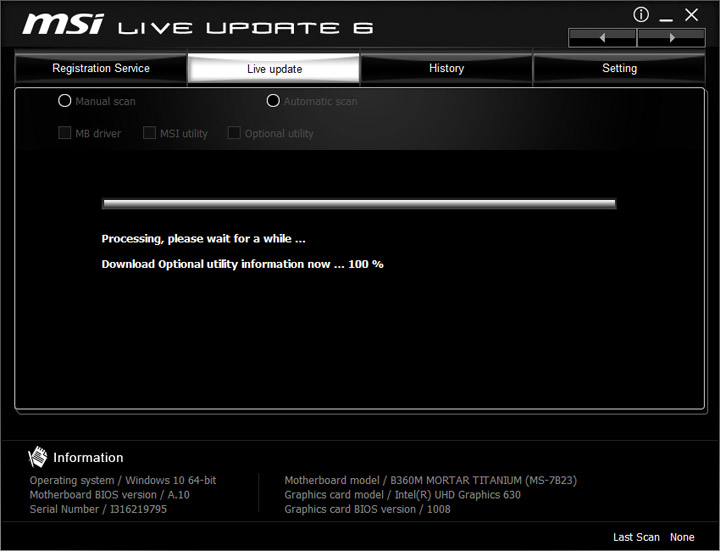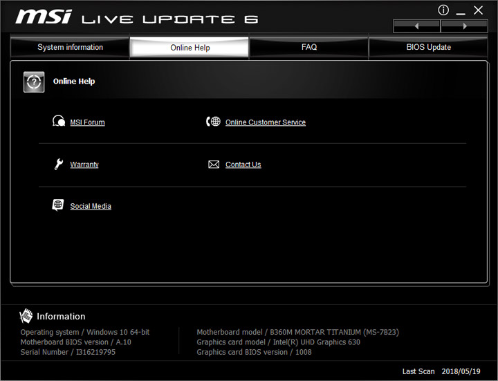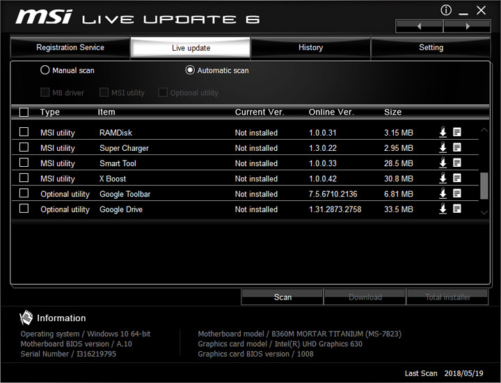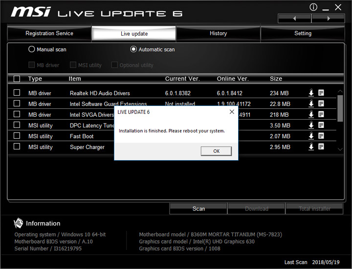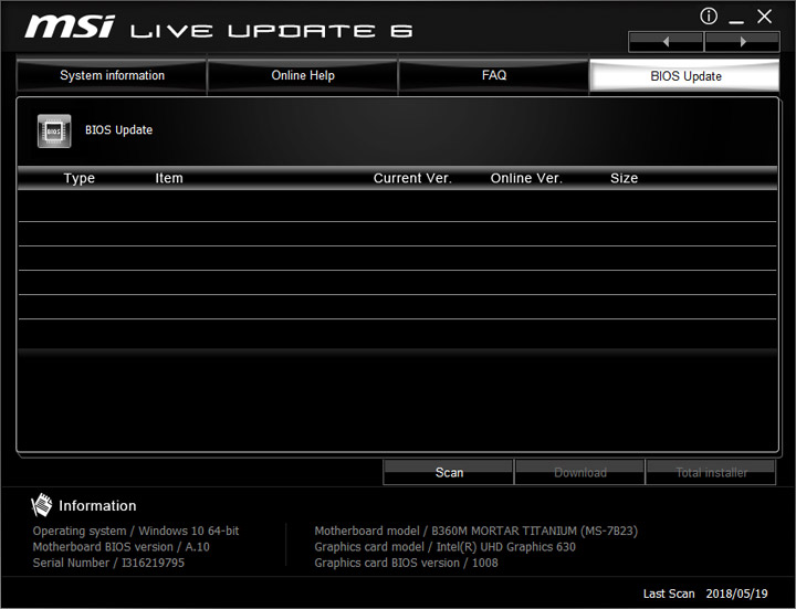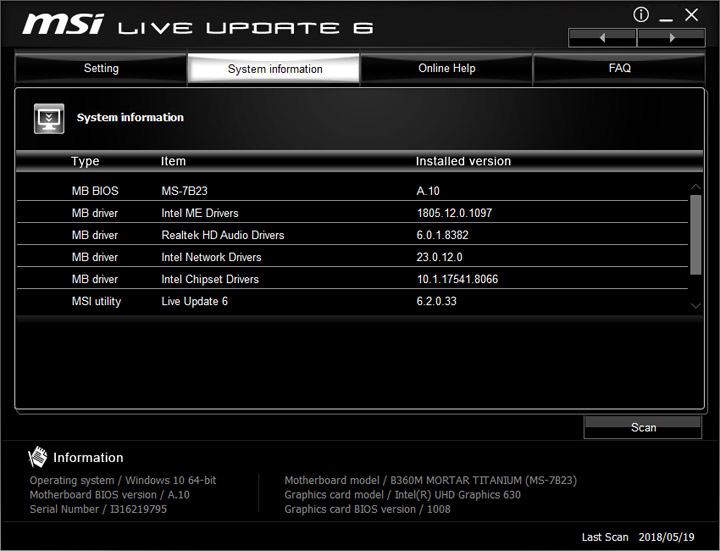 | MSI B360M Mortar Titanium | A.10 | 5.97.4628 | 4.3.784-x64 | 2.4.4264 | 10.0.17134.48 |
