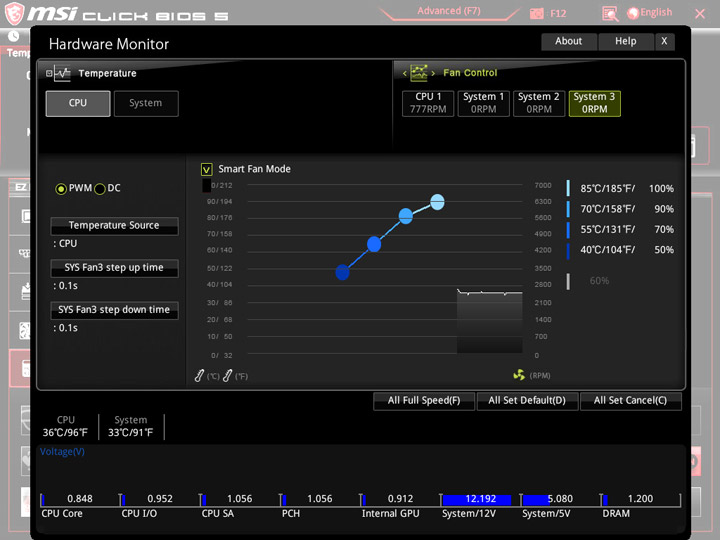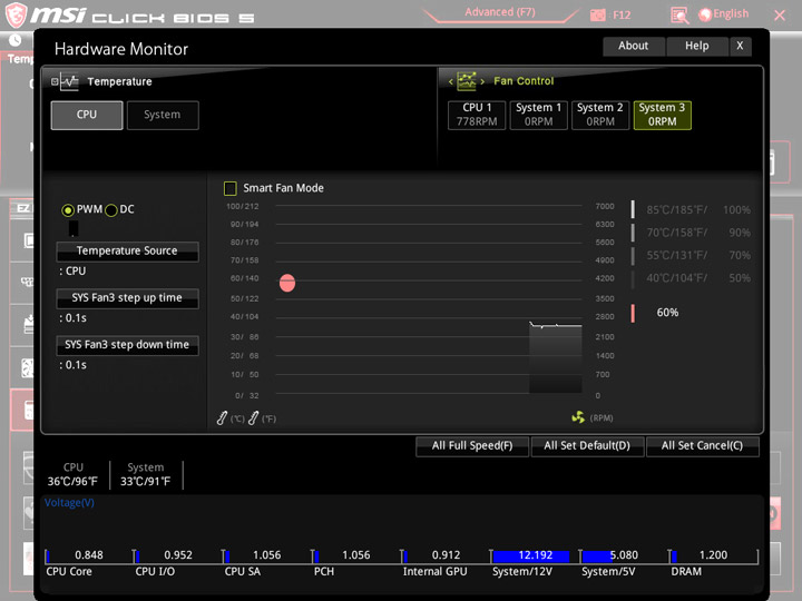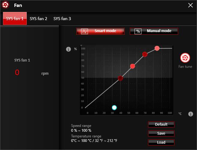 Для всех четырёх колодок под системные охладители доступен выбор способа замедления — изменение напряжения или скважности ШИМ. В роли опорных температур смогут выступить два значения — системы и процессора. Отсутствует, разве что, калибровка, но все проводимые тут операции имеют моментальный эффект, что позволит наладить схему работы без установки особого ПО в среде Windows.