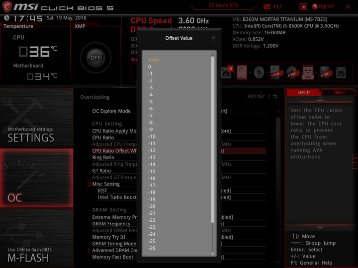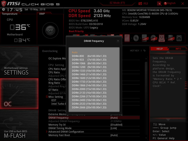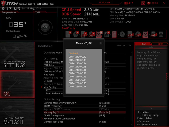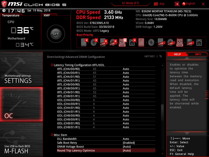 Как нам поведал опыт работы, полученный с Gigabyte H370 Aorus Gaming 3 WiFi, весь «разгон» заключается в тонкой настройке работы модулей памяти на максимально доступной здесь частоте — 2666 МГц. В тот раз мы остановились на схеме 12-12-12-28-1T, а теперь получилось улучшить её до 12-11-11-28-1T. Помимо задержек, фиксировались вспомогательные напряжения (на уровне базовых величин), а DRAM Voltage не было необходимости повышать больше, чем до 1,35 В.