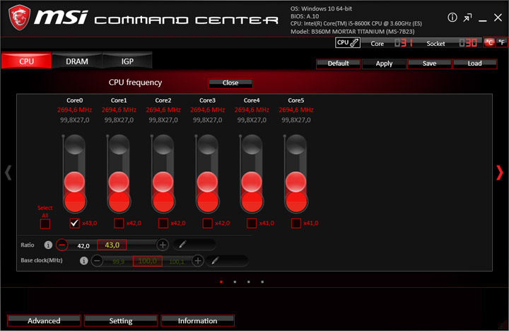 Базовая частота равнялась 99,8 МГц, схема работы процессора соответствовала всем задумкам инженеров родительской компании. То есть, весомая нагрузка понижала частоту до 4,1 ГГц, кольцевая шина всегда была меньше на 300 МГц. Простые задачи выполнялись при 4,2 ГГц, и в совсем редких случаях — при 4,3 ГГц. О невысоких напряжениях на процессоре я могу лишь упомянуть повторно, повышенным был только пункт DRAM Voltage.