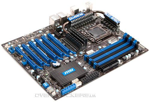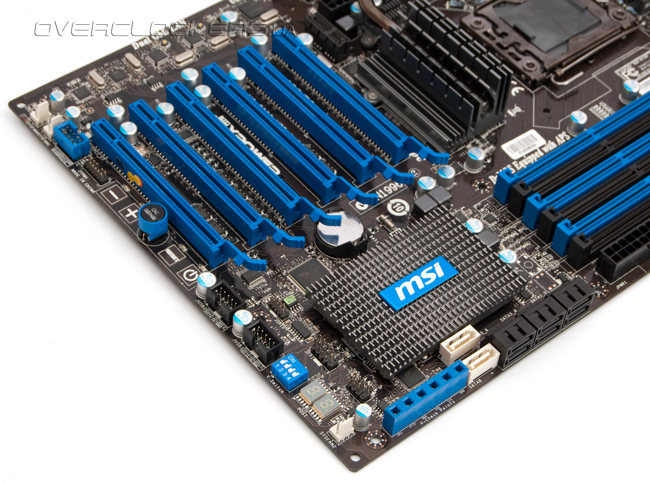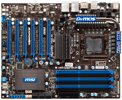 Как и все платы на базе чипсета Intel X58 Express MSI Big Bang-XPower поддерживает процессоры с разъемом LGA1366 и память DDR3. Максимальная частота модулей может достигать 2300 МГц (в зависимости от процессора), а объем — 24 ГБайта. Для более удобной установки и извлечения планок слоты DIMM с одной стороны, где расположен графический интерфейс, лишены привычных защелок — вместо них используются фиксаторы в пазах.