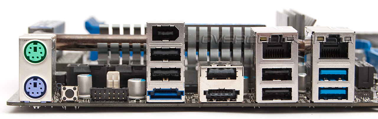 И если плата обладает какими-нибудь интересными конструкторскими решениями, то задняя панель напротив, ничем таким не отличается. Два порта PS/2, восемь USB, включая два порта версии 3.0, один FireWire, по паре eSATA и RJ45 (Realtek RTL8111DL), кнопка ClearCMOS для сброса настоек BIOS и разъем для подключения выносного пульта OC Dashboard — вот, пожалуй, и все.