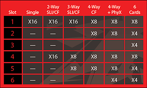 Для плат расширения предусмотрены только слоты PCI Express x16 в количестве шести штук. Один PCI-E x1 все же есть, но он предназначен для установки звуковой карты, хотя, без проблем может принять и любое другое оборудование. Но будем учитывать, что он зарезервирован именно под дискретную звуковую карту. Четыре разъема PCI-E x16 имеют лишь половину контактов, так как при использовании больше двух карт чипсет X58 просто не в состоянии обеспечить их необходимым количеством линий. Сам по себе он может задействовать схему «16+16», «16+8+8» или «8+8+8+8», а при пяти-шести платах расширения конфигурация слотов уже будет следующая: