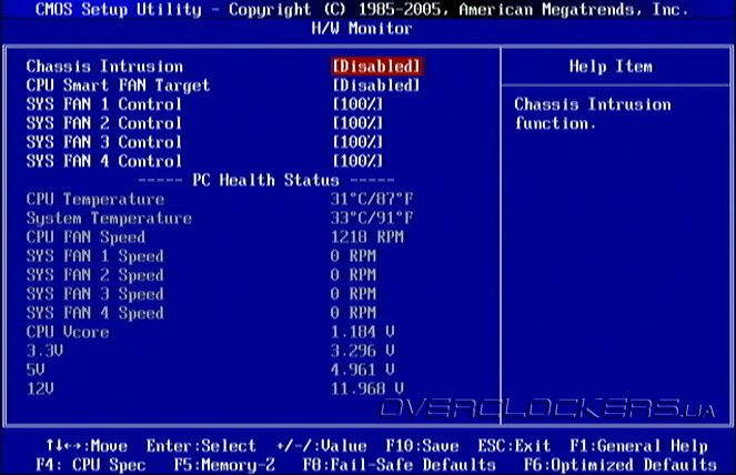 Раздел H/W Monitor отвечает за мониторинг системы, но показателей в нем не особо много. Пользователь может просматривать температуру процессора и платы, скорость вращения пяти вентиляторов, напряжение на процессоре и на трех основных линиях питания. Присутствует также управление скоростями вращения всех вентиляторов.