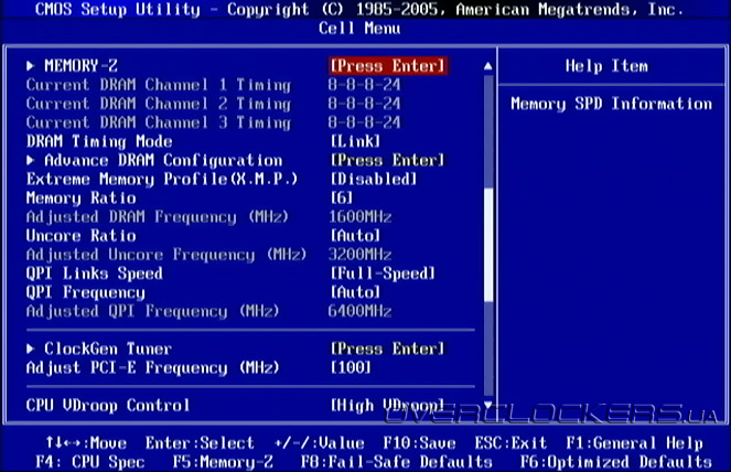 Опции, связанные с тонкой настройкой системы и разгоном сосредоточены в разделе Cell Menu. Доступных параметров хватит даже взыскательному пользователю. В этом меню можно получить информацию по текущим частотам процессора, памяти и шины QPI, по поддерживаемым технологиям и задержкам памяти. Есть возможность управлять множителем процессора, памяти и ее контроллера, QPI, изменять количество активных ядер и энергосберегающие технологии.
