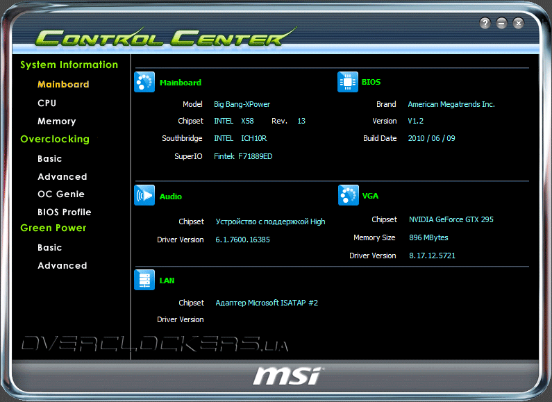 В комплекте с платой поставляется стандартный набор программного обеспечения, знакомого нам по прошлым обзорам продукции MSI. Основными выделим утилиту по обновлению BIOS Live Update 4, и программу по управлению энергосберегающими функциями, тонкой настройке и разгону системы — Control Center.