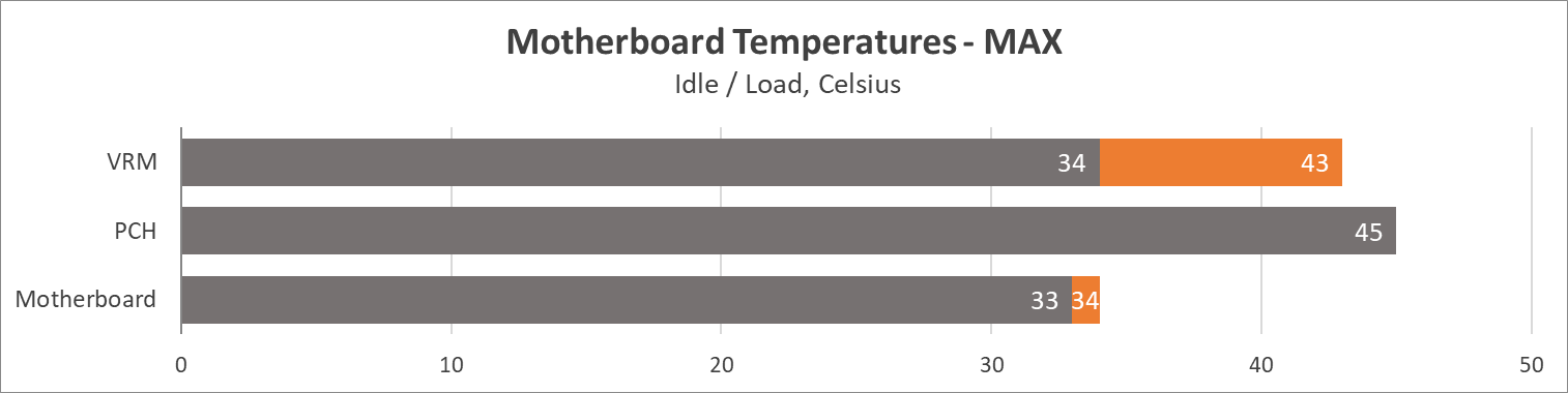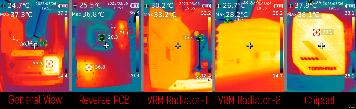 Управление оборотами вентилятора — автоматическое. Температура в помещении была на уровне 20 градусов Цельсия. Показатели температур брались с мониторинга HWINFO, а также с термофото, выполненным тепловой камерой UNI-T RX-600. При фиксации температур материнская плата либо была 30 минут без нагрузки, либо 30 минут под оной. Измерение суммарного энергопотребления платформы производилось с помощью энергометра Feron TM55 и электросчетчика в течение 30 минут в режиме нагрузки (забег LinX) и без него. Измерение энергопотребления отдельно процессора производилось с помощью ElmorLabs PMD. Каждый бенчмарк запускался пять раз, в результатах отмечено среднее арифметическое, то же касается игр. В них происходила запись телеметрии (1% low fps + Average fps) с помощью Riva Tuner Statistics Server. CS:GO (настройки качества — минимальные) — тест на карте мастерской FPS Benchmark от начала сцены бенчмарка до третьего звукового сигнала на черном экране. Остальные игры тестировались на заводских пресетах минимального качества на стандартных бенчмарках.
