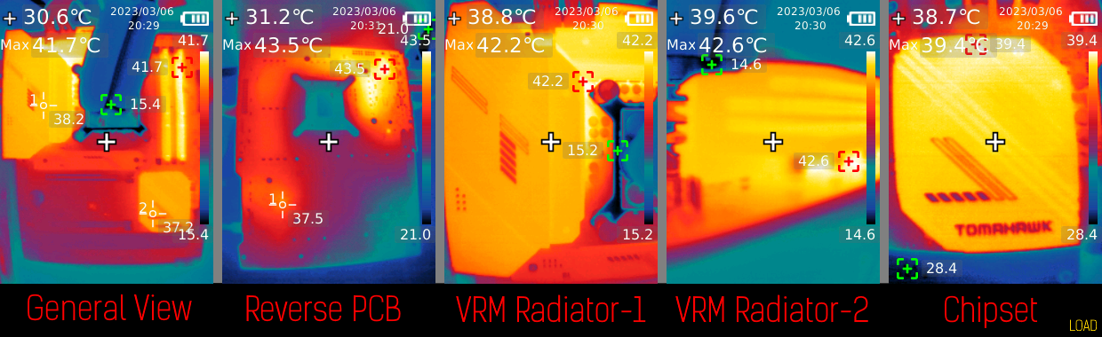Термофото материнской платы без нагрузки, а также под нагрузкой при заводских параметрах автоматики: