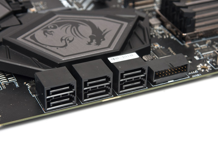 Шесть продольных гнёзд SATA работают от хаба. Под корпусные кабели USB разных типов предусмотрено шесть посадочных мест: два — классического типа 2.0, два — USB 3.1 Gen1 (одно из них продольного типа), наконец, ещё два — под новые, симметричные USB 3.1 Gen2.
