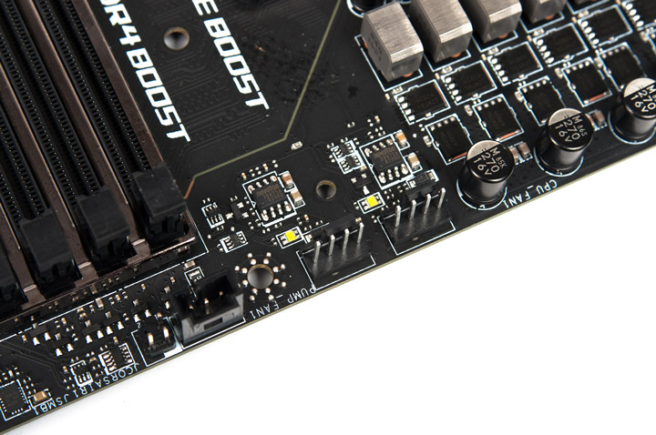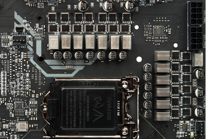 В наличии шесть удвоенных «фаз» для нужд напряжения CPU, ещё одна пара транзисторов обеспечивает напряжением System Agent (CPU SA Voltage), для неё установили дроссель старого образца, с символами «Ti». Представленные транзисторы изготовлены на мощностях ON Semiconductor, это модели NTMFS4C029N и NTMFS4C024N. IR35201 от Infineon выполняет роль основного ШИМ-контроллера. Внешние драйверы в числе шести штук распаяны на тыльной стороне платы, их модели — IR3598. Снова отмечу, функционирование iGPU на этой плате не предусмотрено.