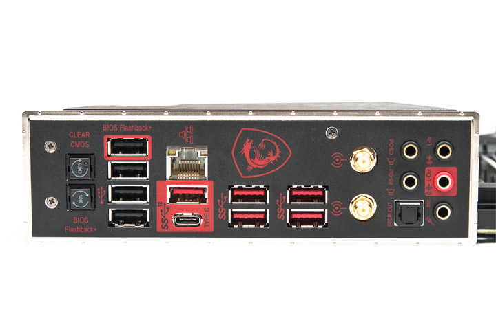 Ввиду отсутствия видеопортов, у инженеров не возникло проблем с обильным оснащением задней панели разномастными выходами USB. Стойка для кабельного сетевого подключения в процессе работы будет светиться красным оттенком. Звуковые порты позолочены. Посетовать можно на отсутствие PS/2, хотя для современного ПК это недочётом назвать трудно.