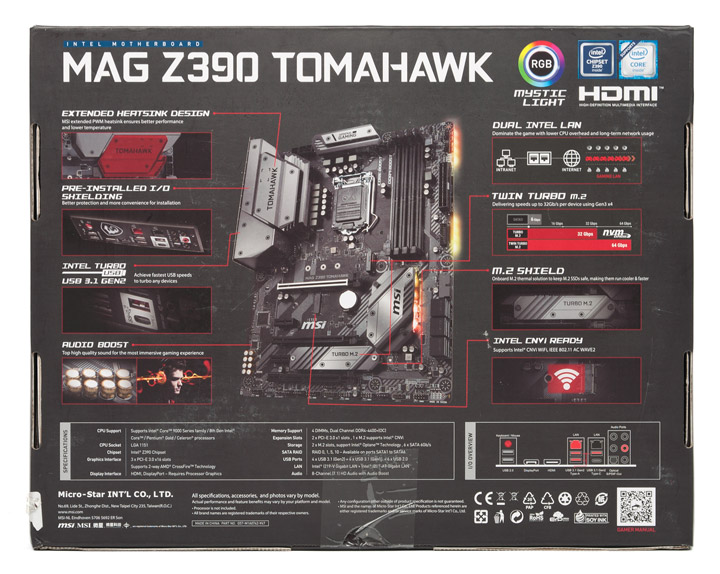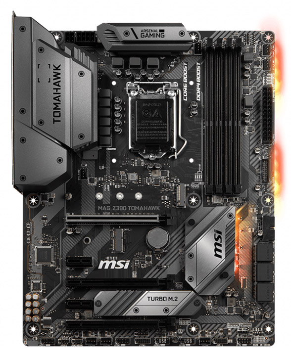Начальные игровые системные платы компании MSI ранее входили в состав серии с названием Arsenal Gaming, нынче об этом факте указывают в префиксе модели, добавив аббревиатуру MAG. Общая идея таких устройств — предложить чуть больше возможностей относительно рядовых изделий, которые включены в серию PRO. От других более статусных плат они отличаются меньшим числом бонусов, например, звуковая составляющая не включает дополнительное ПО, используется кодек базового уровня. Сетевая инфраструктура также не самая обширная, здесь нет добавочного адаптера беспроводных сетей, зато для проводной целых два (оба они на 1 Гбит/с). В роли приятного дополнения выделить можно вдумчивый подход к охлаждению — рассматриваемая модель MAG Z390 Tomahawk насчитывает четыре охладителя для различных узлов.