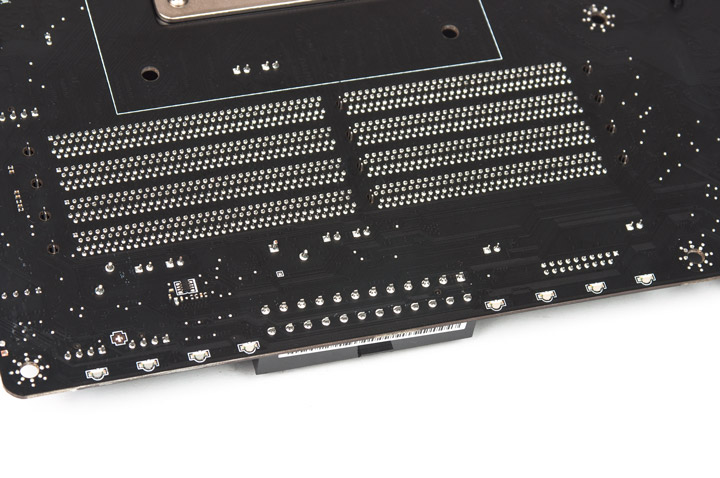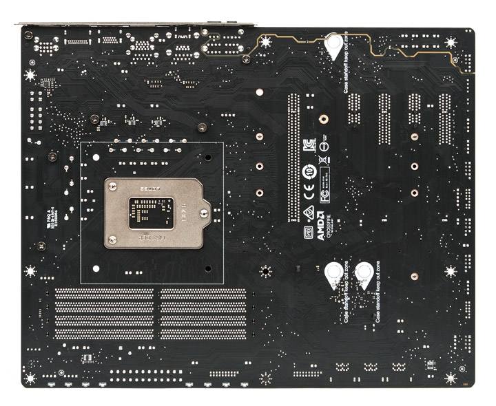 Предусмотрено две поперечные стойки под корпусные кабели интерфейса USB 2.0, ещё две заготовлены для портов типа USB 3.1 Gen1, одна из них продольная. Гнезда для самого современного симметричного выхода в корпусе тут нет, всё же сказывается статус платы.