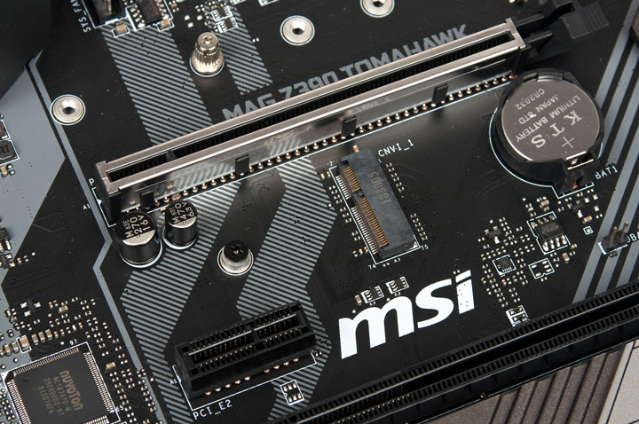 Лишь экранированное гнездо PCI-E x16 взаимодействует с ЦП, все остальные слоты связаны с Intel Z390, причём последнее пусть и полногабаритное, но оперирует лишь одной линией.