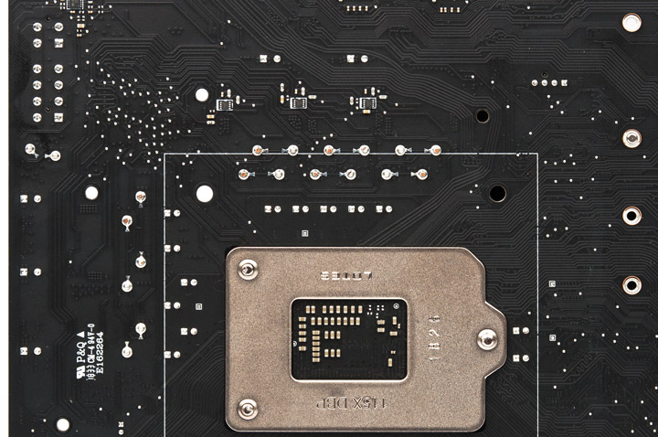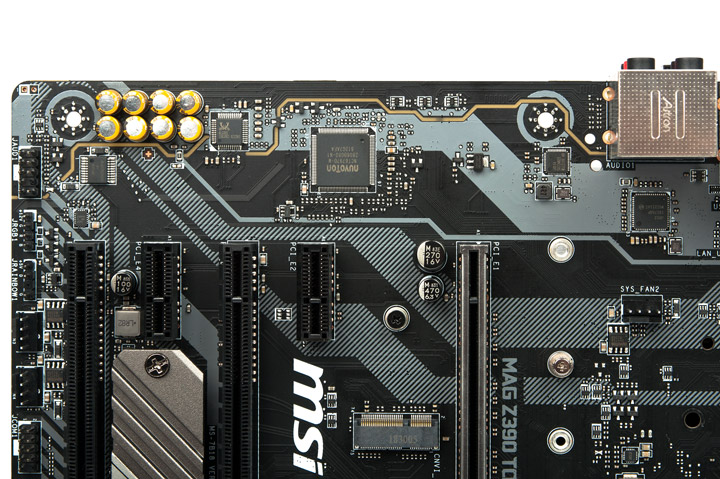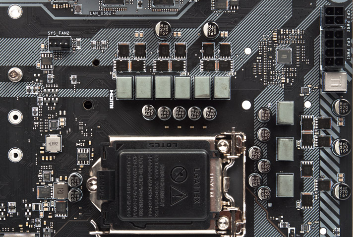 Идея организации построения стабилизатора напряжений не нова и часто встречалась в наших обзорах, один из предыдущих был посвящён родственной модели MSI — MPG Z390 Gaming Plus. У ШИМ-контроллера uP9521 от uPI Semiconductor главная роль, ему помогают пять отдельных драйверов. Общая схема работы — 4+1 «фазы», число транзисторов в каждом процессорном канале удвоено, а для iGPU суммарно их три штуки. Используются модели ON Semiconductor — NTMFS4C029N и NTMFS4C024N.
