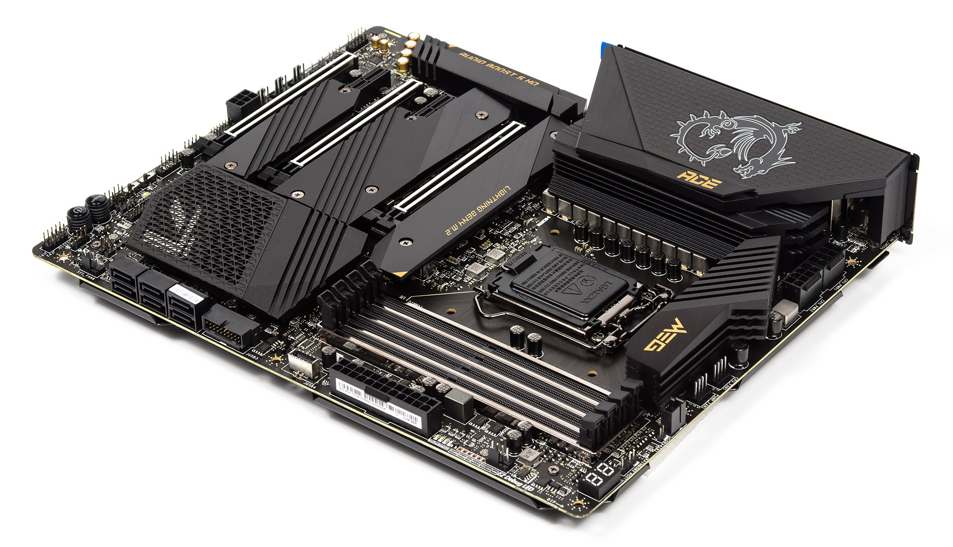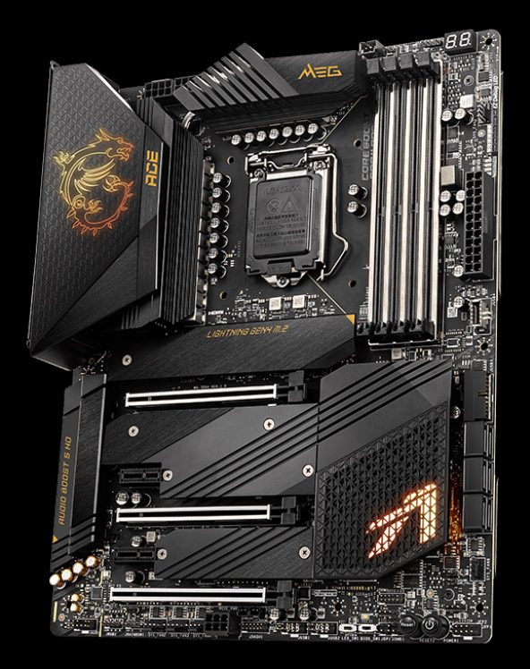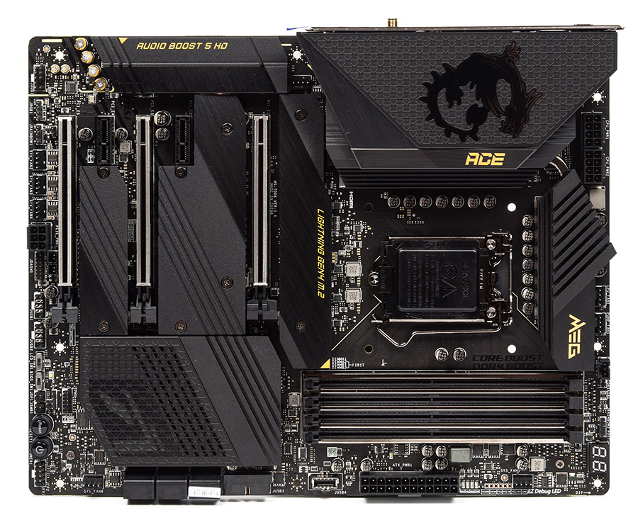 Серия MEG знаменует собой флагманские изделия игровой направленности, в разрезе материнских плат здесь максимально насыщенным функциональными возможностями продуктом выступает модель Godlike, но мы будем рассматривать чуть более скромную — Ace. Прежде её основной «фишкой» был отказ от видеовыходов на задней панели, теперь от этого канона отошли и сзади есть HDMI 2.0b. Устройство является предельно наполненным интерфейсными выходами, кнопками, индикаторами и прочими мелочами, благодаря чему даёт возможность нам в полной мере ощутить дух всего поколения продуктов.