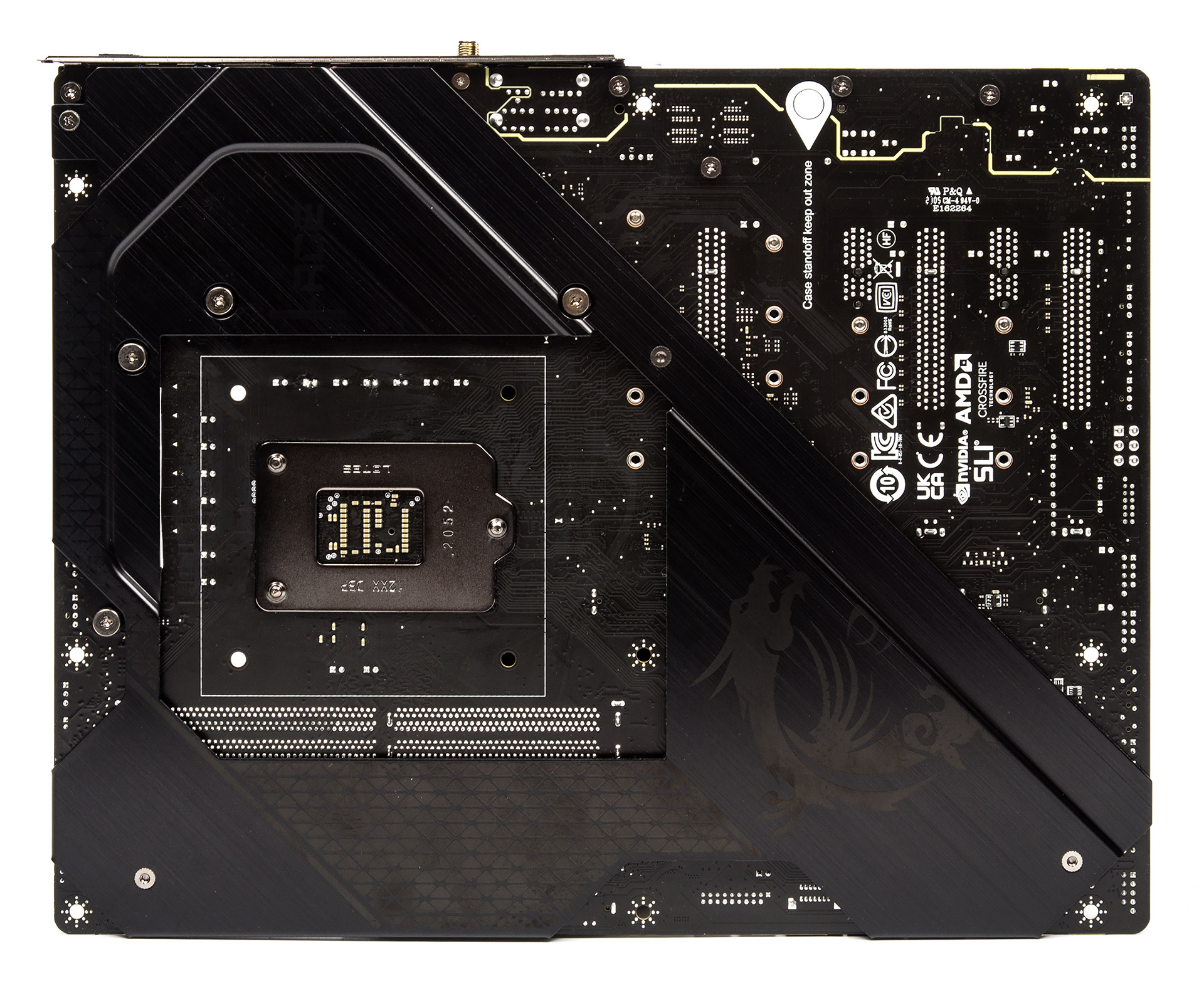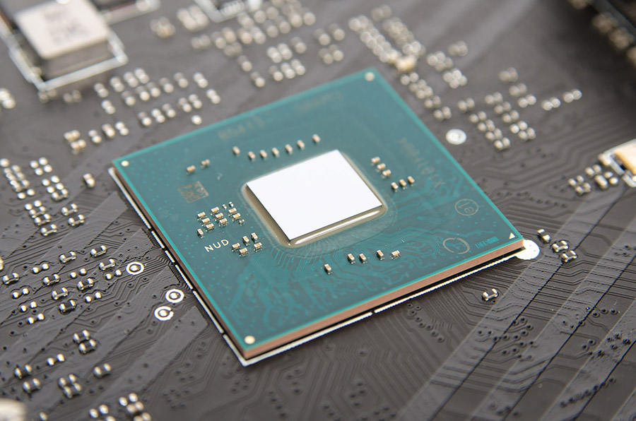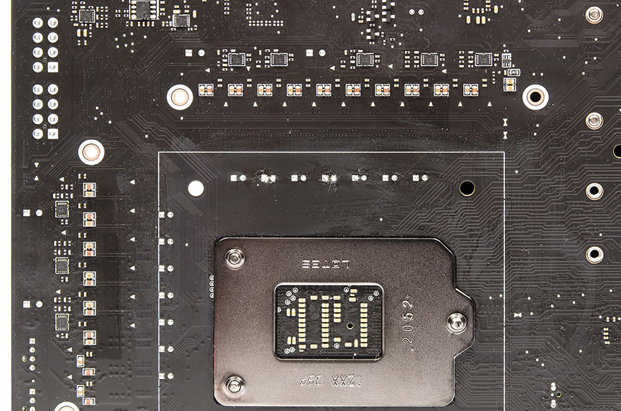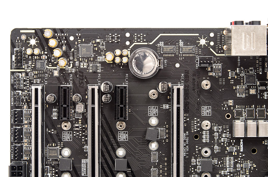 На плате рядом с системной логикой нет ничего, включая часто используемые в последнее время светодиоды. Повторители (ReDriver) и свитчи (Mux/DeMux) линий PCI-E 4.0 ЦП объединены в одном корпусе четырёх новых микросхем PI3EQX16012 производства Diodes Incorporated.