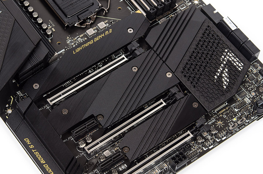 Деление шестнадцати линий от ЦП для нужд ВК будет проходить между верхними PCI-E x16, остальные три слота взаимодействуют с чипсетом. Нижний делит ресурсы с рядом расположенным M.2 — работать сможет лишь что-то одно из них.