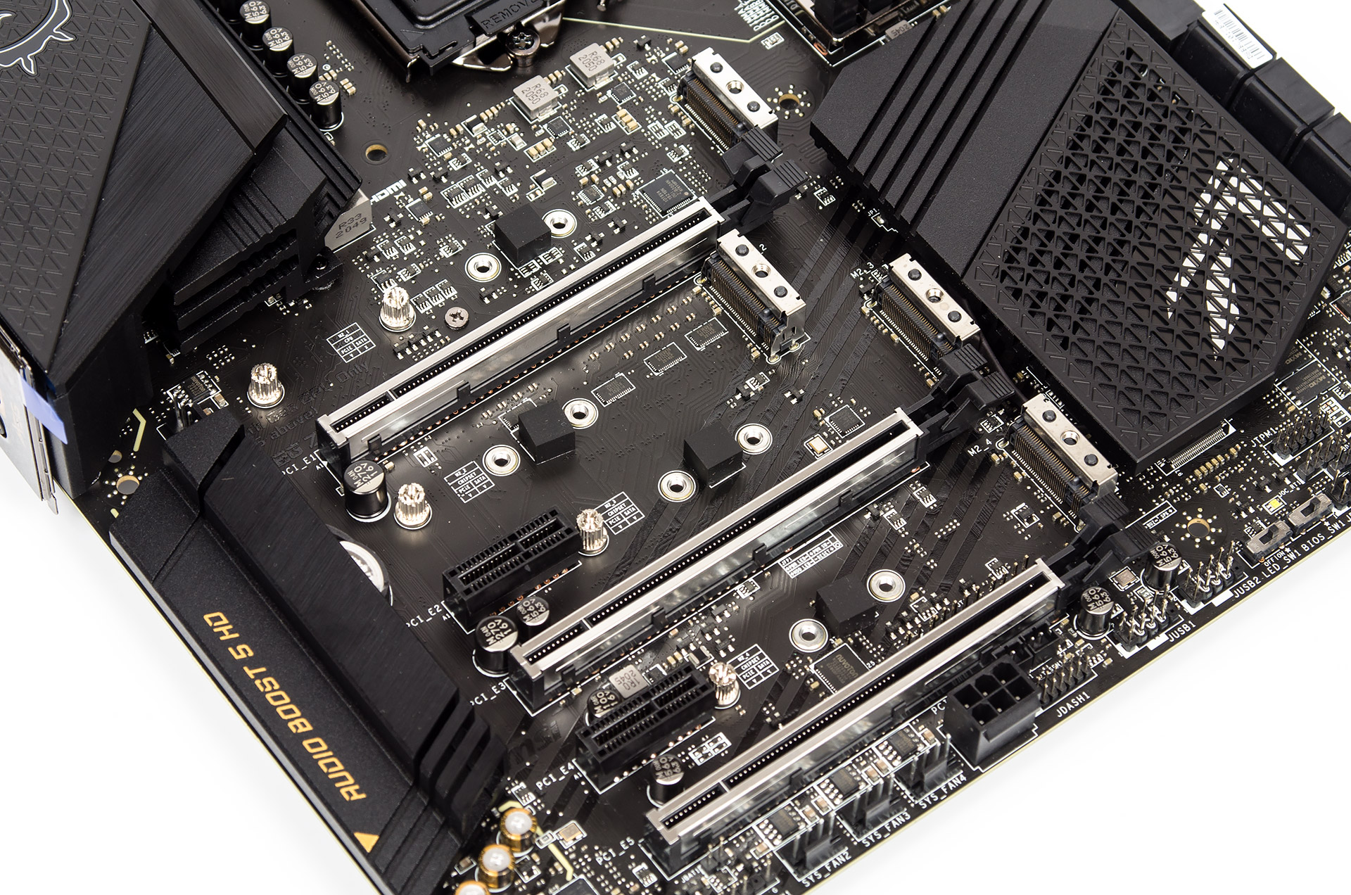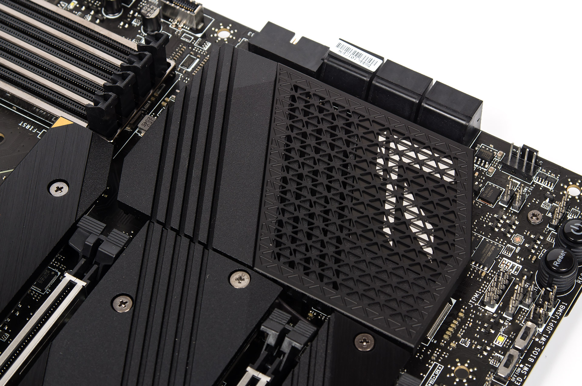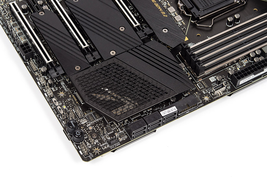 Самым непривычным и оттого заметным внедрением стали четыре посадочных места для накопителей M.2. Везде предустановлены радиаторы. Ещё можно выделить два гнезда на восемь контактов для нужд питания процессора и одно на шесть — под усиление графической подсистемы, в случае использования нескольких устройств.