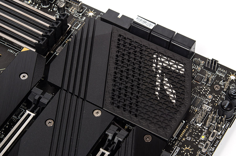 Пара радиаторов на цепях стабилизатора напряжений ЦП объединена тепловой трубкой. Сперва кажется, что в который раз пластик наползает над металлом и всё портит, но, если присмотреться, и по снимку можно увидеть переход литой части от традиционной формы к элементу, обволакивающему порты на задней панели. Словом, структура радиатора достаточно сложная, а сверху всё прикрыто накладкой с подсветкой. Расстраиваться тут нет повода, как покажут эксперименты — качество всего узла и его охлаждение в частности выполнены на совесть.