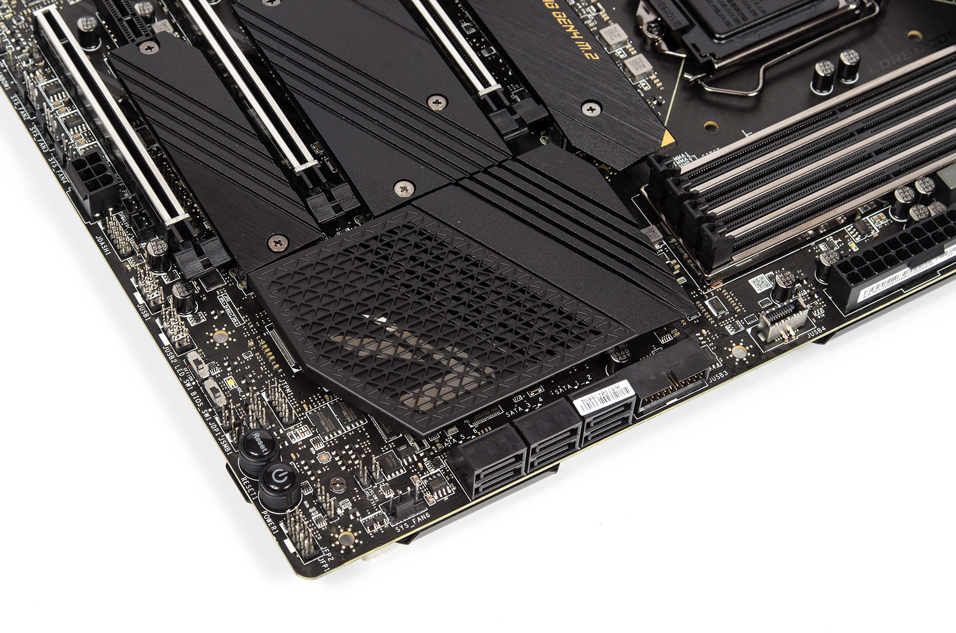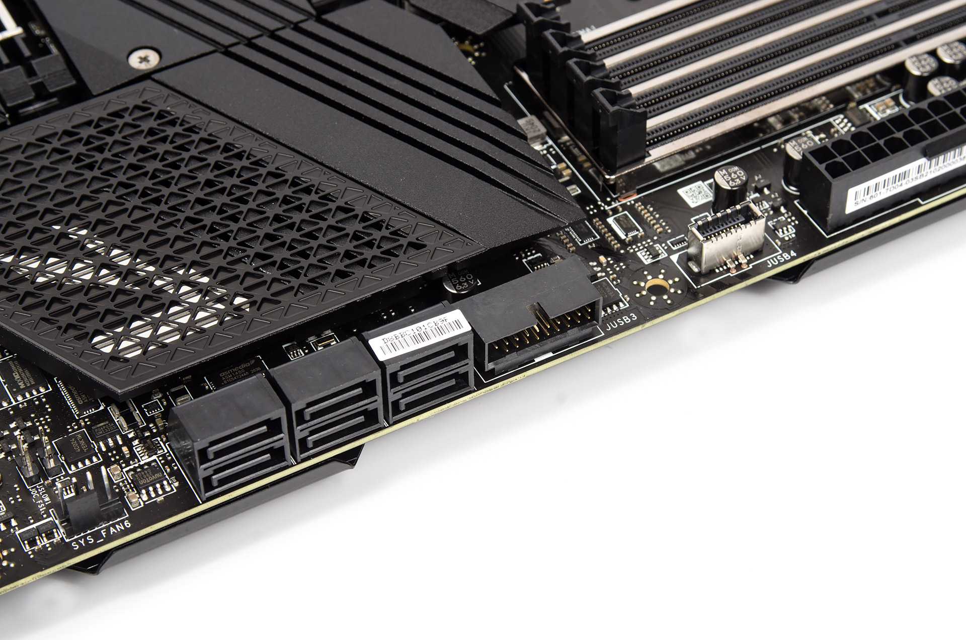 На правом торце продольными гнёздами набраны шесть выходов SATA и проводится кабельное подключение корпусных USB 3.2 Gen 1. Контактную площадку для симметричного выхода USB 3.2 Gen 2 производители пока ещё с упорством делают поперечной.