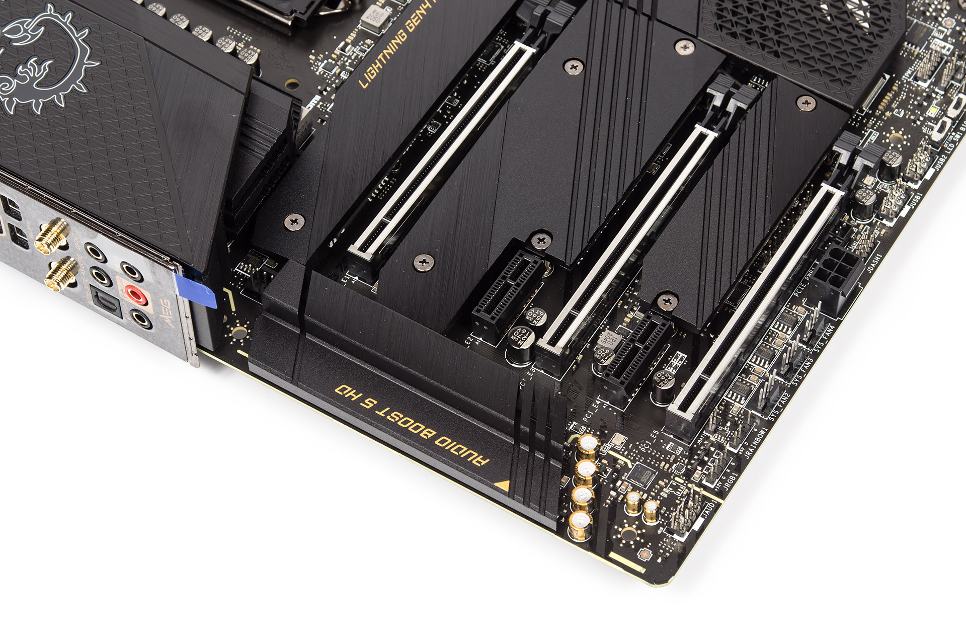 Идея организации звуковой подсистемы перекочевала из модели предыдущего поколения (MEG Z490 Ace) с важным изменением — теперь используется новый кодек Realtek ALC4082 (с 68 выводами). На снимке не видно экранирующих элементов, но это из-за демонтированного нами увесистого металлического «бруска», который более чем способен выполнить эту функцию. Остались прежними обособленный ЦАП и специализированные конденсаторы. Окошко слева внизу позволяет подсчитать число слоёв текстолита и здесь их восемь, к тому же с удвоенным количеством меди (8 Layer PCB with 2oz Thickened Copper).
