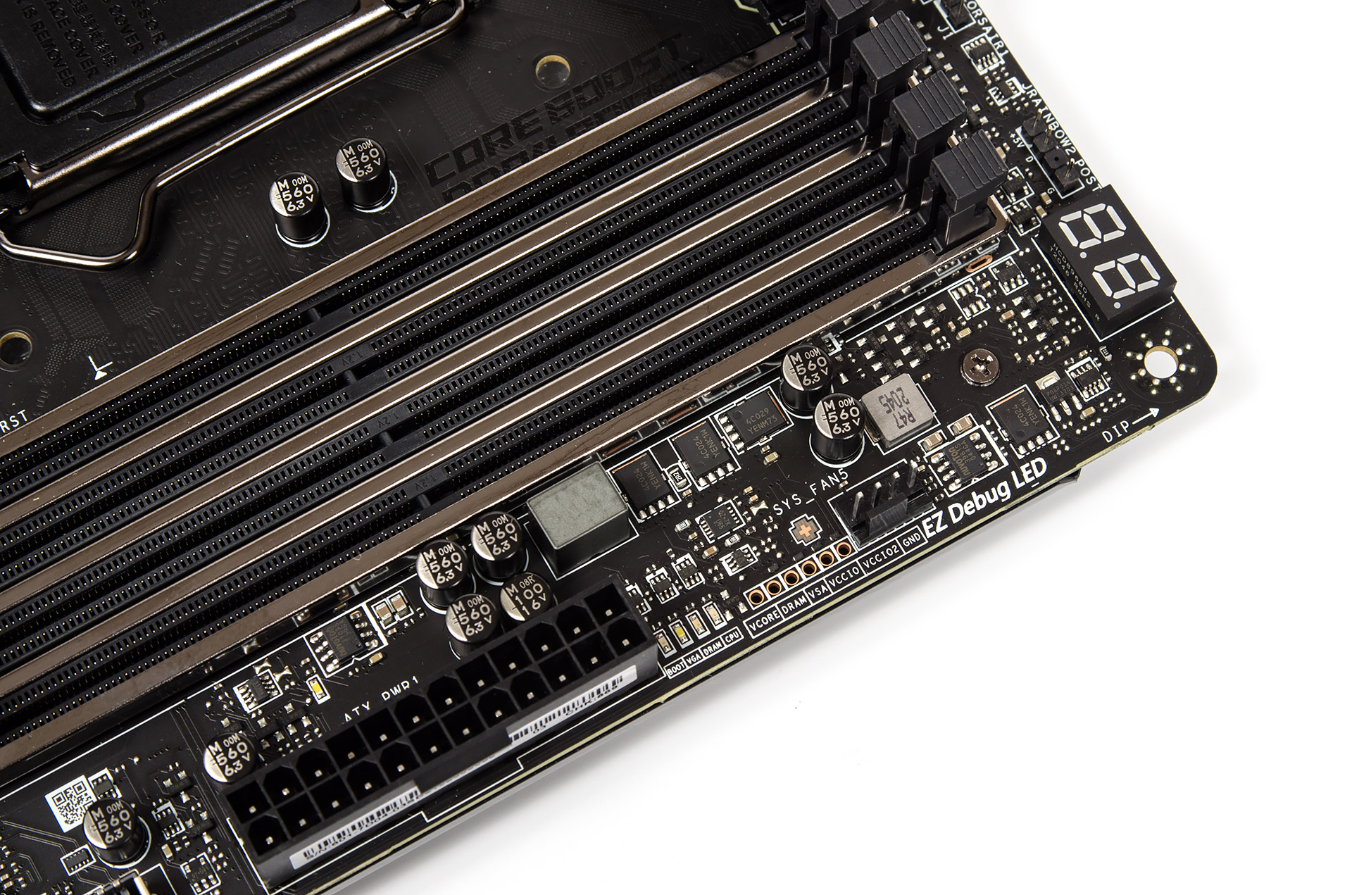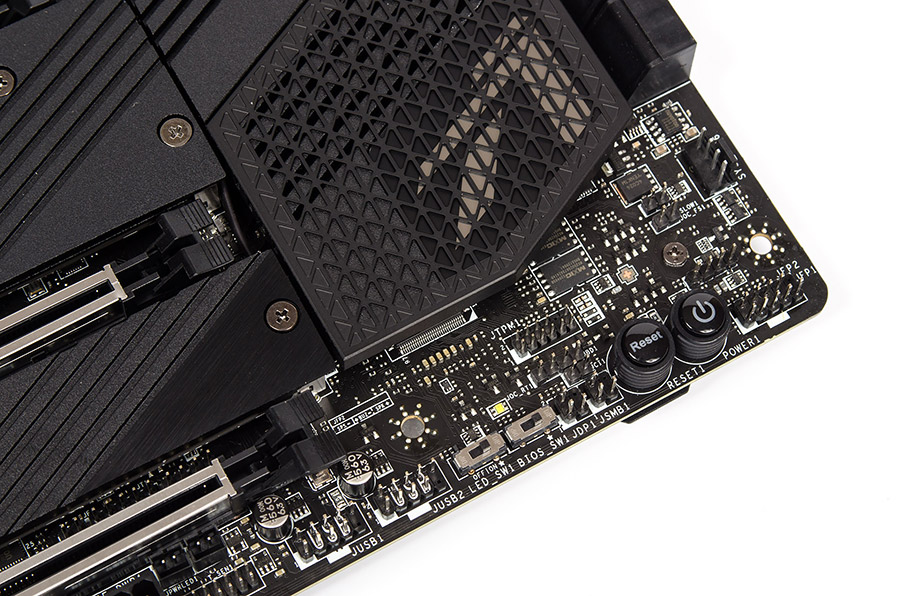 Диагностический узел расположился справа вверху. Двухсегментный индикатор кодов POST располагает белым свечением, при работе операционной системы, в зависимости от опций UEFI, здесь отобразится температура с различных узлов ПК, с начальными настройками — процессорная. Четыре более простых светодиода из набора EZ Debug LED — разноцветные, а рядом с ними есть площадка для проведения замеров уровней напряжения всех основных системных узлов.