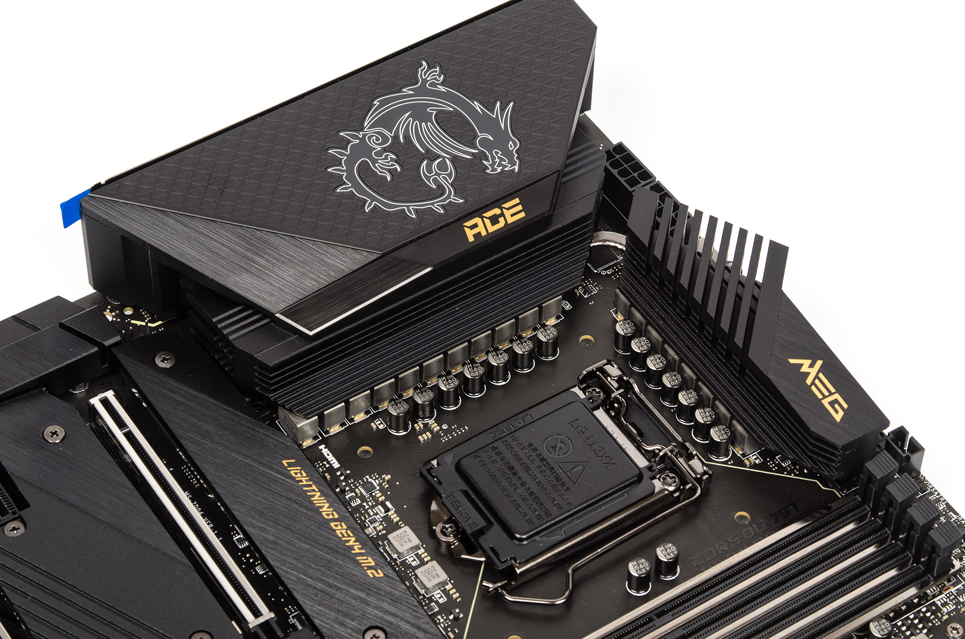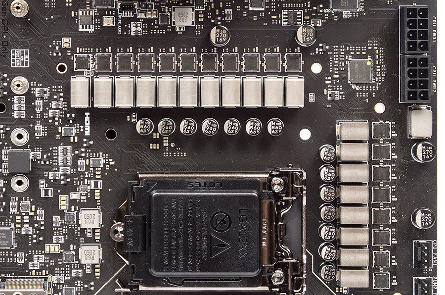 Подсистема питания представляет собой усовершенствованный вариант того, что заложили в составе MEG Z490 Ace. Используется тот же ШИМ-контроллер — ISL69269, посредством восьми удвоителей (PWM Doubler) модели ISL6617A реализовано шестнадцать каналов для выработки напряжения CPU, сборки от Renesas Electronics — ISL99390BFRZ (Smart Power Stage (SPS) Modules). Одна фаза необходима для SA Voltage и ещё две, чего прежде не было, появились для напряжения iGPU. Удвоителей нет, сборки, соответственно, одна AOZ5312UQI (Alpha and Omega Semiconductor) и две RAA220075 (Renesas Electronics). Ниже сокета разместилась пара независимых каналов IO + IO 2 Voltage на базе TPS56C230 (Texas Instruments). Здесь обошлись без радиатора. Также видны совершенно новые дроссели. Из-за появления напряжения ГП возросло число используемых конденсаторов.
