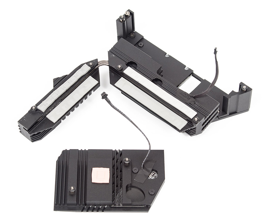 Видим четыре независимых радиатора. Центральный рассчитан на два места, но в случае использования одного накопителя площадь рассеивания окажется увеличенной и это весьма находчиво, учитывая расположение под греющейся видеокартой.