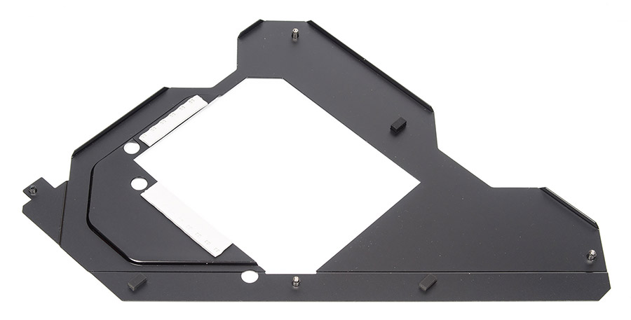 Число и разновидность привлечённых термопрокладок способно удивить. Контакт тыльной пластины с платой происходит посредством элементов достаточно небольшой площади, но лучше так, чем вообще без них.
