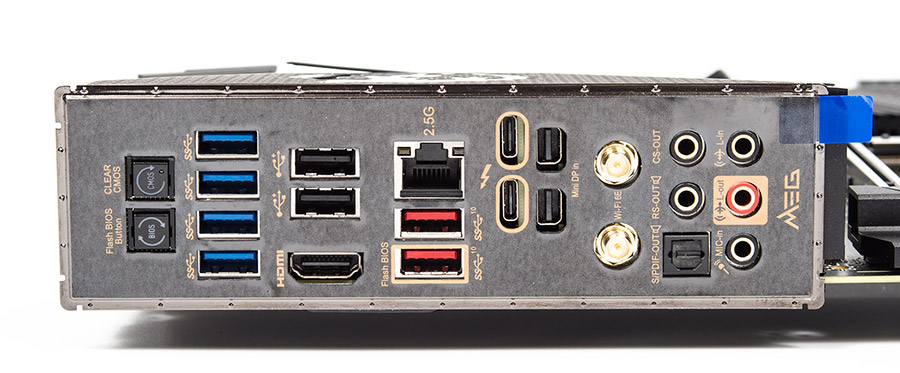 На задней панели гвоздём программы является пара Thunderbolt 4, рядом с ними распаяны mini DP для нужд проброса видеосигнала на те выходы, для чего необходимо его передать от ВК, чему участливо может помочь комплектный кабель небольшой длины. В остальном набор достаточно разномастен и обширен. Кто-то может взгрустнуть за отсутствующим PS/2. Кнопка для проведения сброса настроек CMOS сопровождается красным оттенком свечения.