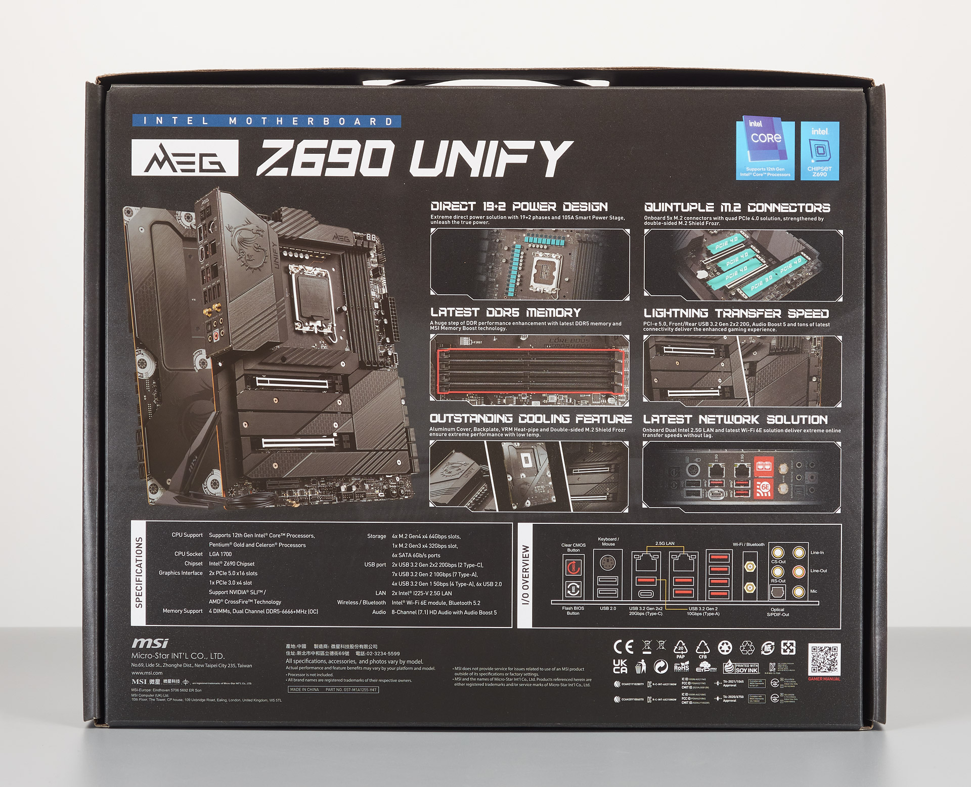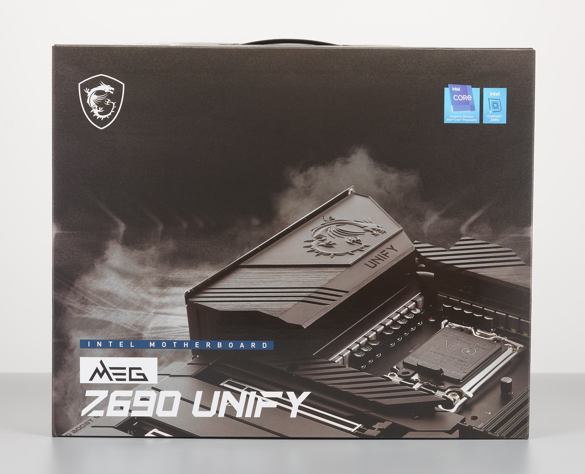 MSI MEG Z690 Unify поставляется в крупной матовой коробке с ручкой, никаких защитных пломб не предусмотрено, коробка легко открывается.