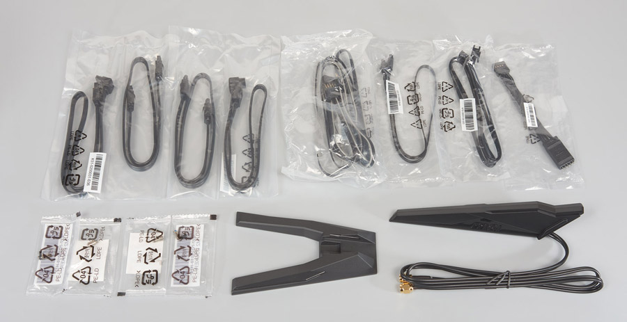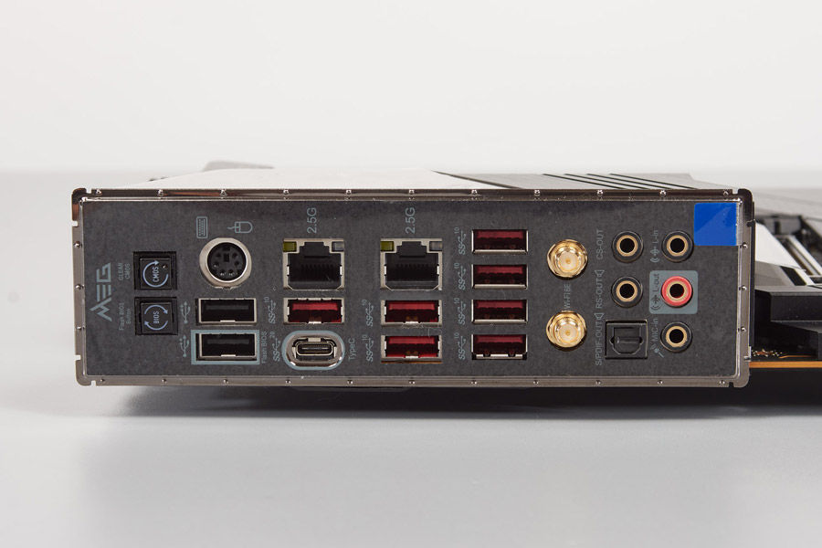I/O-панель уже снаряжена заглушкой. Для удобства выведены кнопка «CLEAR_CMOS» и «Flash BIOS Button». Будучи оверклокером хочется сказать: «Спасибо!» за разъем PS/2. В наличии множество портов USB, включая коннектор Type-C с возможностью туннелирования PCI-E, все необходимые разъемы аудио, два коннектора RJ-45 для сетевых карт, а также Wi-Fi антенна.