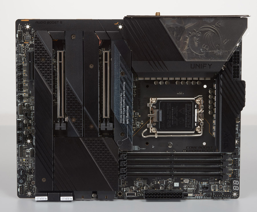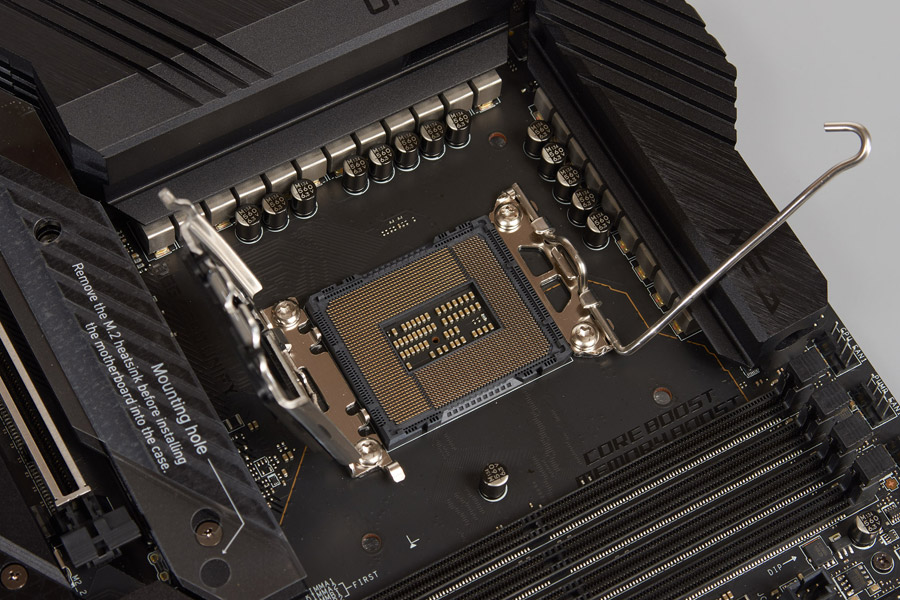 Первое впечатление — строгая плата с практичной компоновкой. Дизайн выполнен в темных тонах (серо-черный), есть на кожухе текстура «под карбон», а также узор на радиаторе интерфейсной панели. Да, это именно радиатор, а не кусок пластмассы, что не может не радовать. Из недостатков топологии монтажа элементов хочется отметить позицию батарейки CR2032, она скрыта под кожухом, и для доступа к ней нужно снимать радиатор M.2. Кроме того, она в позиции типичного размещения видеокарты, что тоже усложнит к ней доступ в условиях собранной в корпусе системы. Еще не самым лучшим решением было прятать монтажное отверстие за верхний радиатор M.2, соответственно, чтобы установить или снять материнскую плату из корпуса, придется дополнительно скручивать радиатор, благо об этом предупреждает наклейка на этом самом радиаторе.