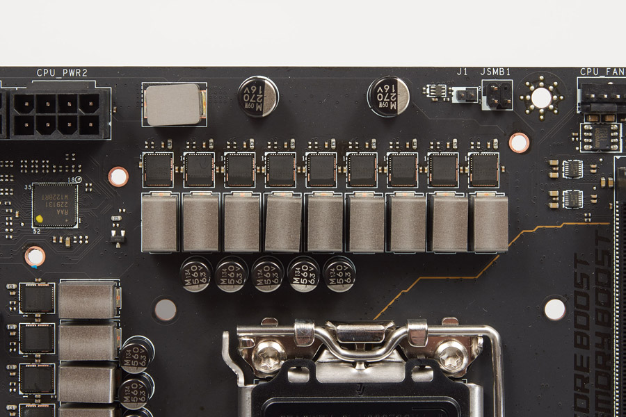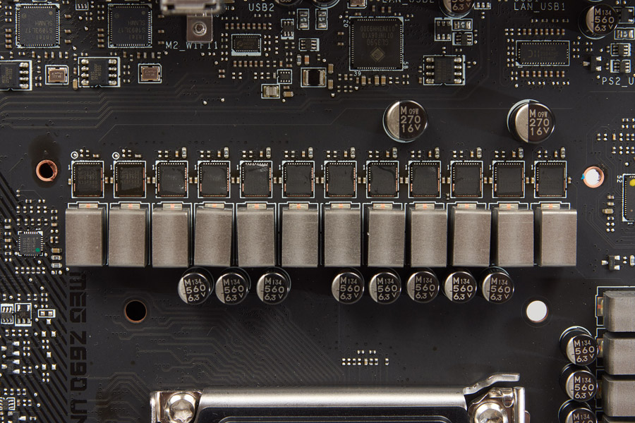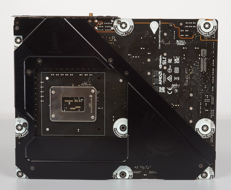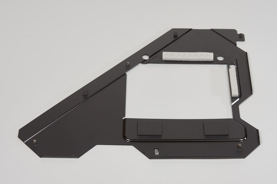 Как уже было сказано, металлическая пластина с обратной стороны платы не только для жесткости, она тоже помогает в охлаждении зоны VRM, контактируя с текстолитом с помощью термопрокладок.