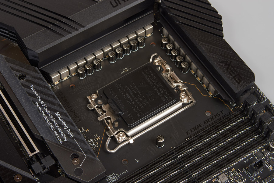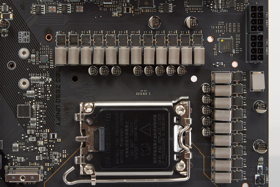 Теперь более подробно о других узлах, и начнем с сокета. Ничего лишнего на площадке для монтажа, а значит велика вероятность отсутствия проблем с монтажом различных суперкулеров, или СВО. Сокет LGA 1700 — стандартный, без каких-либо ухищрений. Слоты оперативной памяти ничем не интересны.