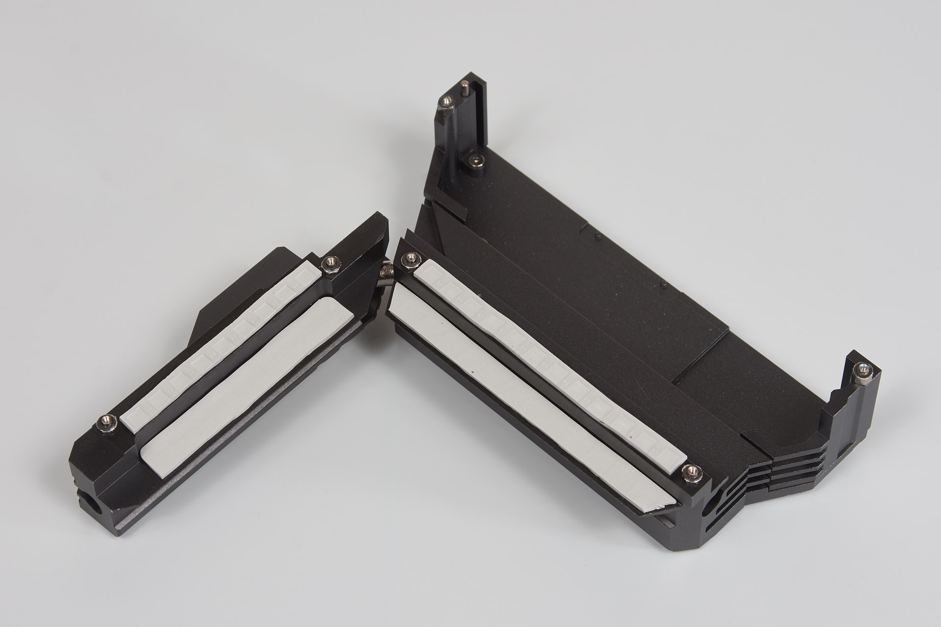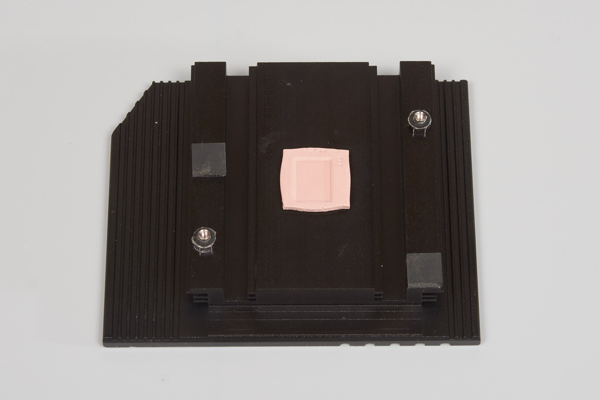 Радиатор контактирует с подсистемой питания с помощью термопрокладок, и обладает ребрами для улучшения теплоотвода.