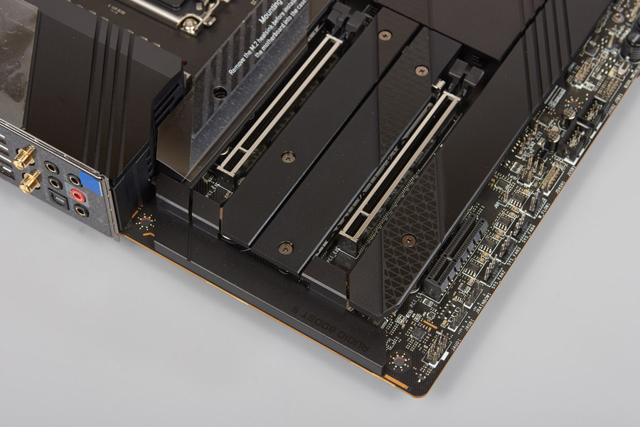 На виду три слота расширения PCI-E, верхний — полноценный x16 5.0, второй по конструкции полноформатный, но разведено только восемь линий ревизии 5.0, третий же x4 3.0 с вырезом, он подключен напрямую в чипсет Z690.