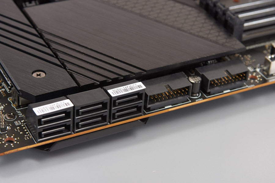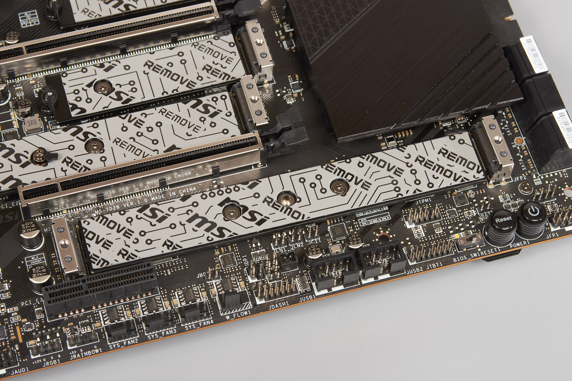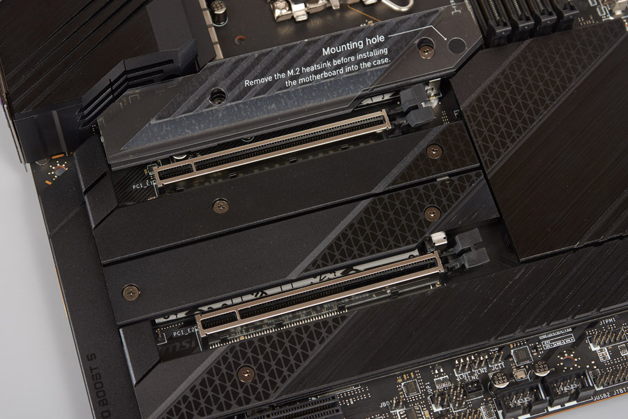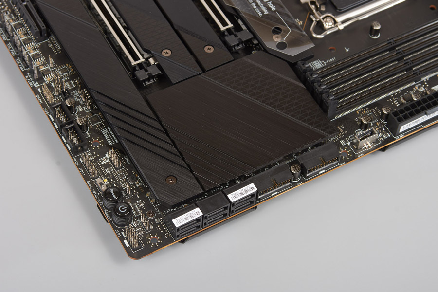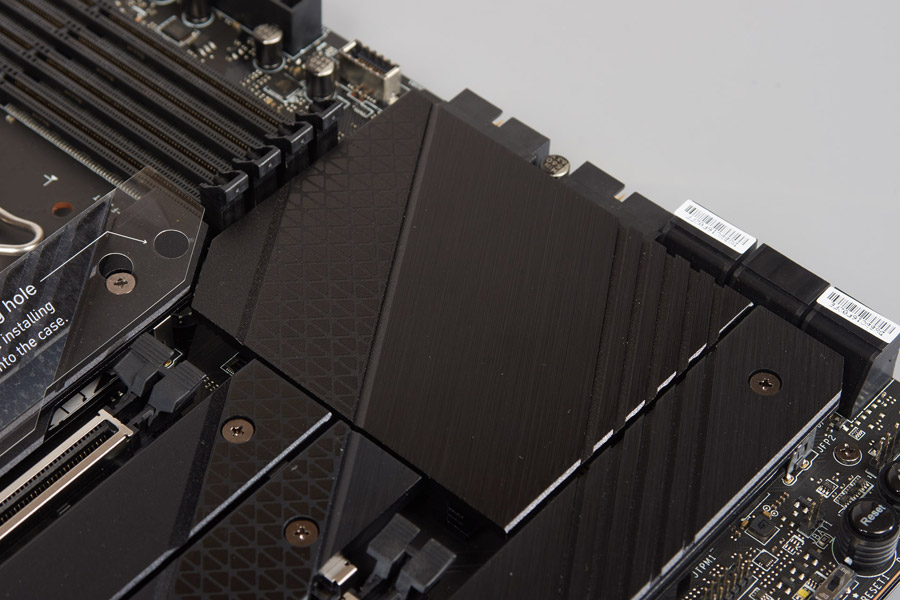 А вот в чем плата очень сильна, так это в возможностях M.2. Целых пять посадочных мест, которые к тому же охлаждаются с помощью двустороннего радиатора. Вот как это выглядит: