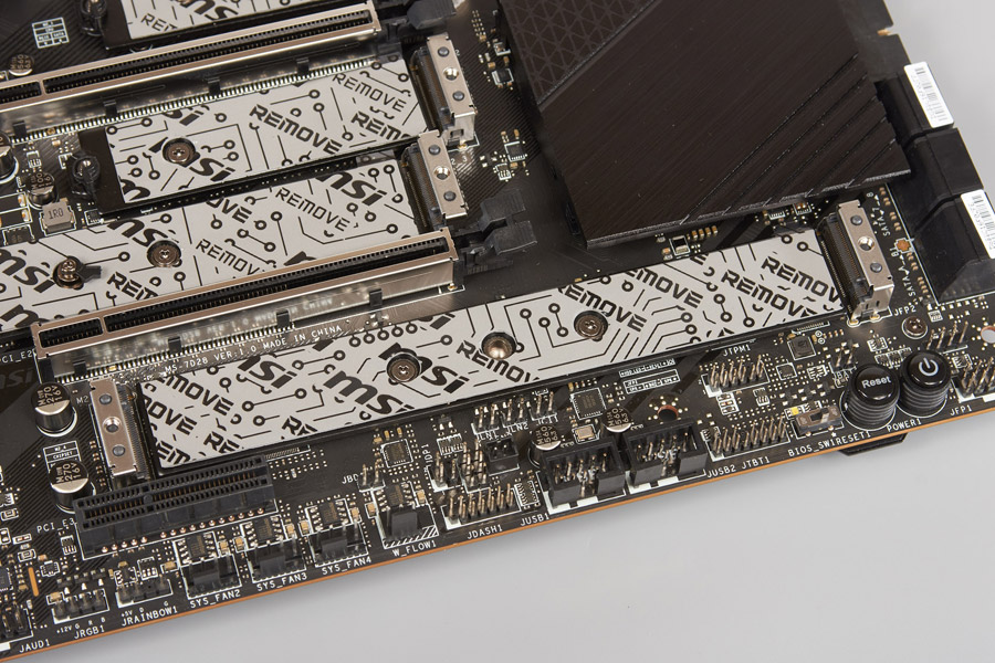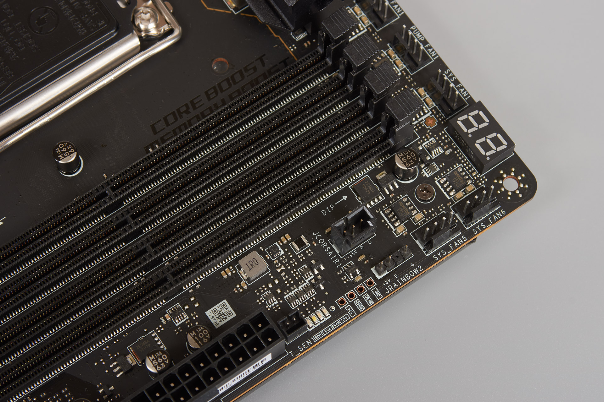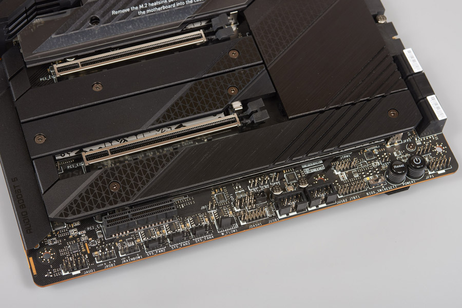 Перейдем к тому, что не скрыто «под щитом». Внизу платы собраны: колодка аудио, четыре колодки подключения вентиляторов, две колодки RGB, две колодки USB 2.0, переключатель прошивок, кнопки запуска и перезагрузки, колодка передней панели, а также специфические колодки, вроде CLR_CMOS, LN2, датчик вскрытия шасси.